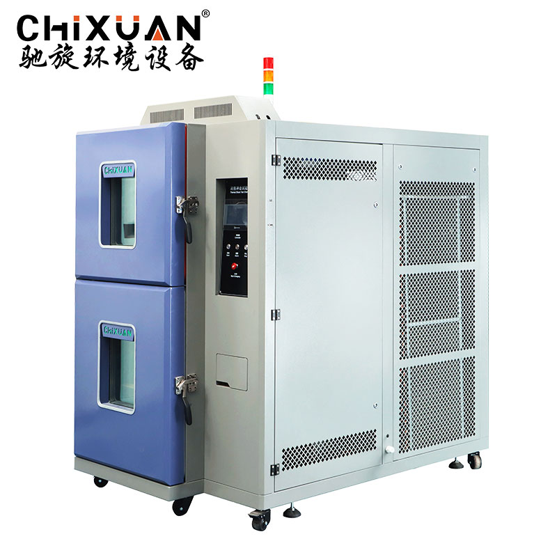 试验箱左侧为高温区,右侧为低温区,试件放置在提篮处,通过电机、气缸等装置带动提篮运动来实现高低温的切换。