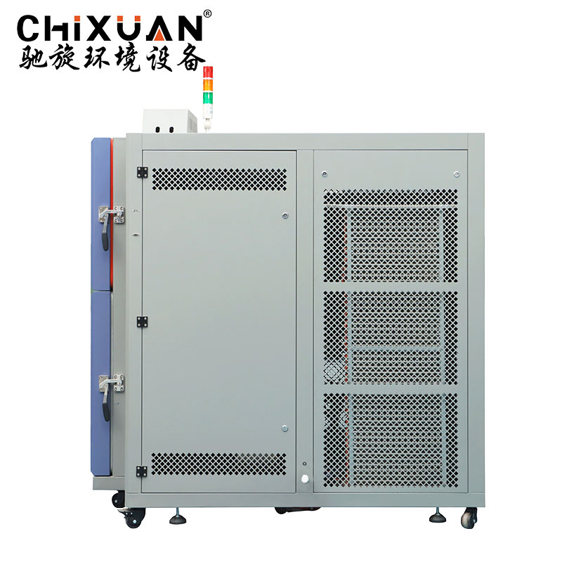 试验箱左侧为高温区,右侧为低温区,试件放置在提篮处,通过电机、气缸等装置带动提篮运动来实现高低温的切换。